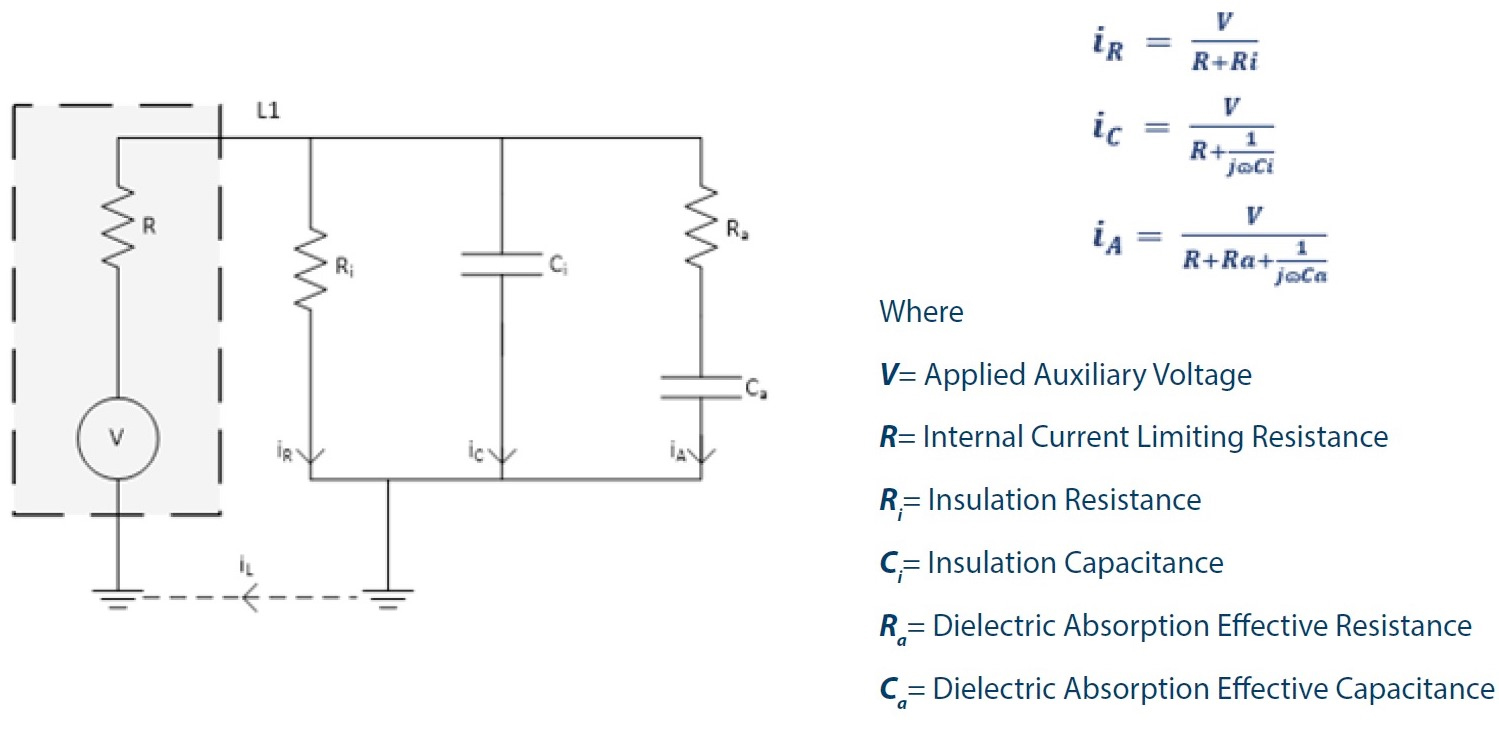 The principle of insulation monitoring is to apply a voltage between the copper conductors in a cable and earth and measure the current that flows. The figure below shows the equivalent circuit of the ‘earth’ to conductor connection.